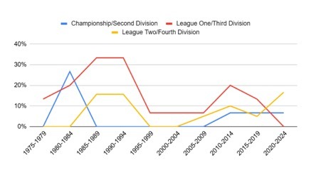 Back in the 1970s, 20% of clubs in the Third Division (today’s League One) achieved back-to-back promotions, but that has trended downwards to just 5% between 2020 and 2024.
