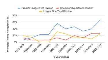 Back in the late 1970s, only 7% of teams that earned a spot in the First Division were immediately sent back down to the second tier. The turbulent times of the late 90s, saw this jump to 57%, but rather than settle back down, they have remained high and jumped higher again to 67% between 2020 and 2024.
